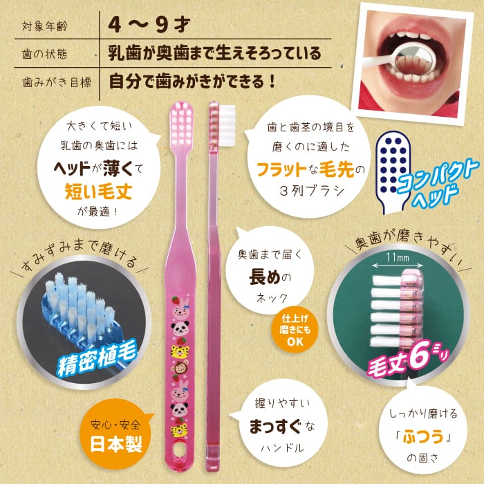 お子様のお口の奥まで届きやすい短め毛丈=6mm。